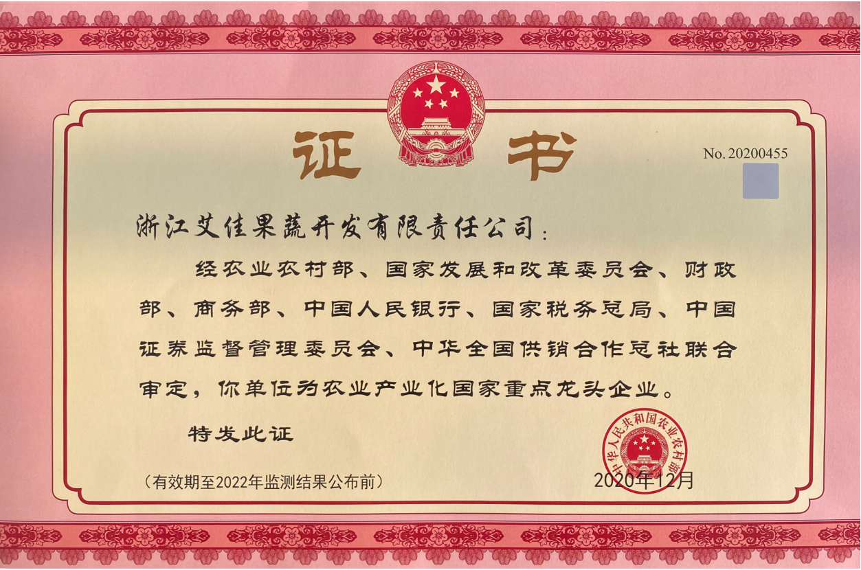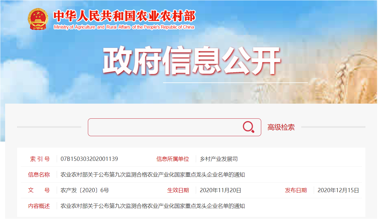 2020年12月,中华人民共和国农业农村部对2018年监测合格和递补的农业产业化国家重点龙头企业开展了第九次监测。经各省(区、市)初步监测、农业农村部组织专家评审和全国农业产业化联席会议审议,浙江艾佳等1120家农业产业化国家重点龙头企业监测合格,123家企业因达不到规定标准和要求,监测不合格,取消农业产业化国家重点龙头企业资格。